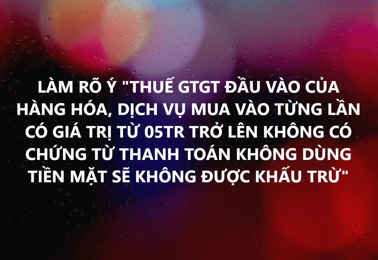 LÀM RÕ Ý "THUẾ GTGT ĐẦU VÀO CỦA HÀNG HÓA, DỊCH VỤ MUA VÀO TỪNG LẦN CÓ GIÁ TRỊ TỪ 05TR TRỞ LÊN KHÔNG CÓ CHỨNG TỪ THANH TOÁN KHÔNG DÙNG TIỀN MẶT SẼ KHÔNG ĐƯỢC KHẤU TRỪ"