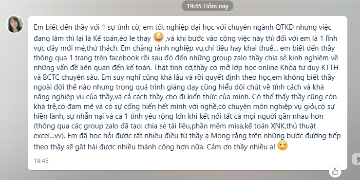 Em biết đến thầy với 1 sự tình cờ, em tốt nghiệp đại học với chuyên ngành QTKD nhưng việc đang làm thì lại là Kế toán,éo le thay :') ,và khi bước vào công việc này thì đối với em là 1 lĩnh vực đầy mới mẻ,thử thách. Em chẳng rành nghiệp vụ,chỉ tiêu hay khai thuế... em biết đến thầy thông qua 1 trang trên facebook rồi sau đó đến những group zalo thầy chia sẻ kinh nghiệm về những vấn đề liên quan đến kế toán. Thật tình cờ,thầy có mở lớp học online Khóa tư duy KTTH và BCTC chuyên sâu.