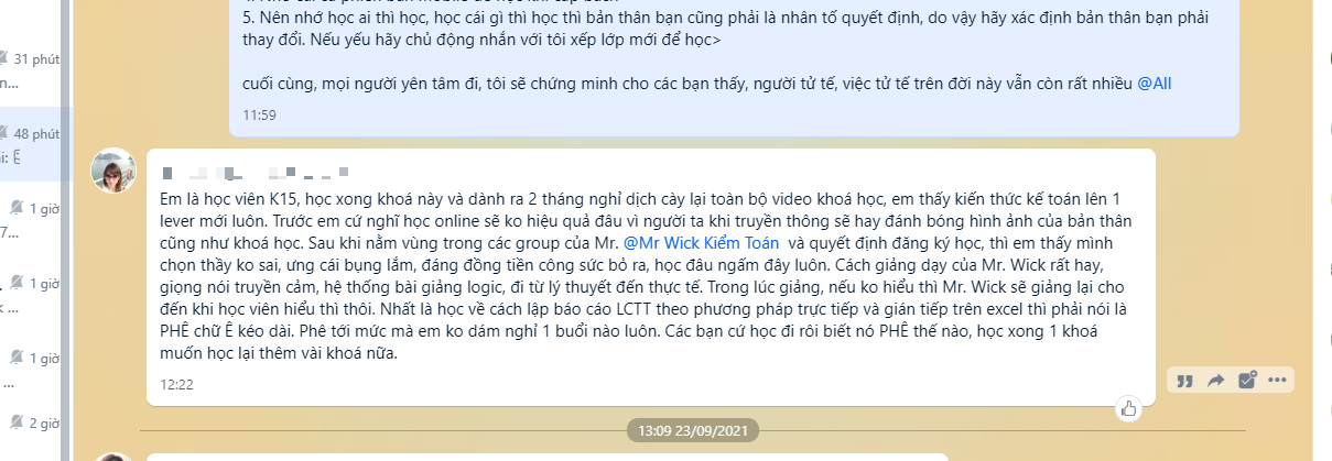 Em là học viên K15, học xong khoá này và dành ra 2 tháng nghỉ dịch cày lại toàn bộ video khoá học, em thấy kiến thức kế toán lên 1 lever mới luôn. Trước em cứ nghĩ học online sẽ ko hiệu quả đâu vì người ta khi truyền thông sẽ hay đánh bóng hình ảnh của bản thân cũng như khoá học. Sau khi nằm vùng trong các group của Mr. @Mr Wick Kiểm Toán và quyết định đăng ký học, thì em thấy mình chọn thầy ko sai, ưng cái bụng lắm, đáng đồng tiền công sức bỏ ra, học đâu ngấm đây luôn. Cách giảng dạy của Mr. Wick rất hay, giọng nói truyền cảm, hệ thống bài giảng logic, đi từ lý thuyết đến thực tế. Trong lúc giảng, nếu ko hiểu thì Mr. Wick sẽ giảng lại cho đến khi học viên hiểu thì thôi. Nhất là học về cách lập báo cáo LCTT theo phương pháp trực tiếp và gián tiếp trên excel thì phải nói là PHÊ chữ Ê kéo dài. Phê tới mức mà em ko dám nghỉ 1 buổi nào luôn. Các bạn cứ học đi rôi biết nó PHÊ thế nào, học xong 1 khoá muốn học lại thêm vài khoá nữa.