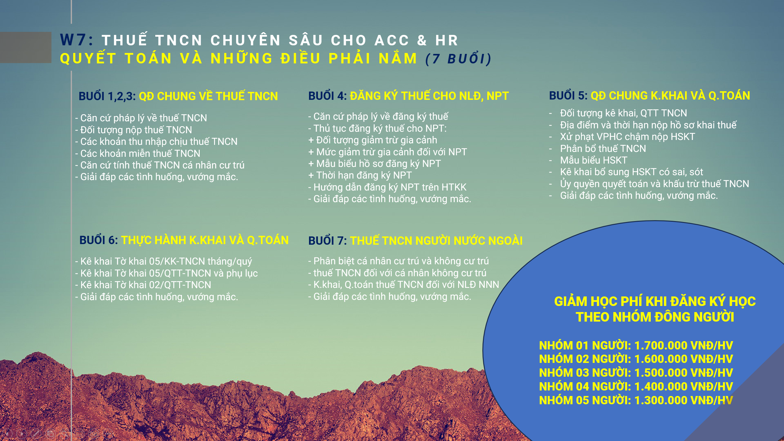 – Khóa học Thuế TNCN cho Kế toán & Nhân sự Toàn quốc chỉ trong 7 buổi. Khóa học W7 được thiết kế thực chiến, giúp học viên hiểu bản chất – làm được ngay.